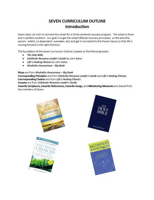 We have consolidated our story and learning into this document just for you. Inside you will find various resources that we use to organize an open discussion or meeting on a specific topic. Each of the 12 lesson outlines correlates with the appropriate AA Step and Celebrate Recovery Choice. The lessons provide recommendations for songs, scriptures, additional reading, and perspective from a member of Seven. The last page of the document, “Twelve Steps and Associated Character Attributes,” provides great topics or additional teaching points for recovery meetings.